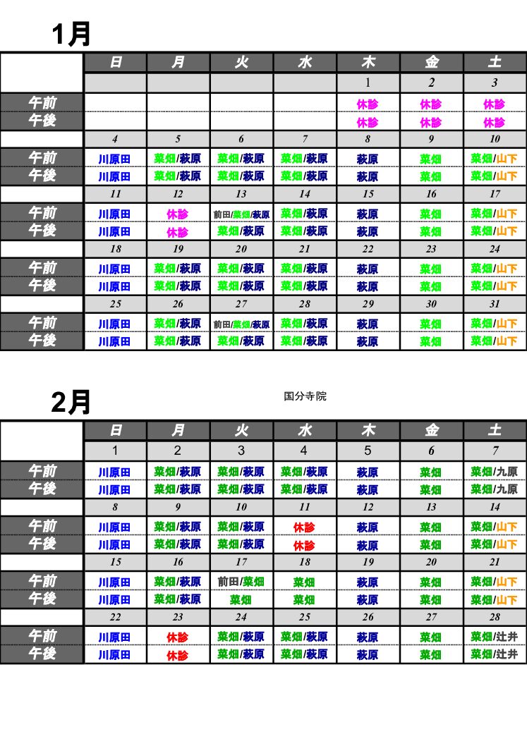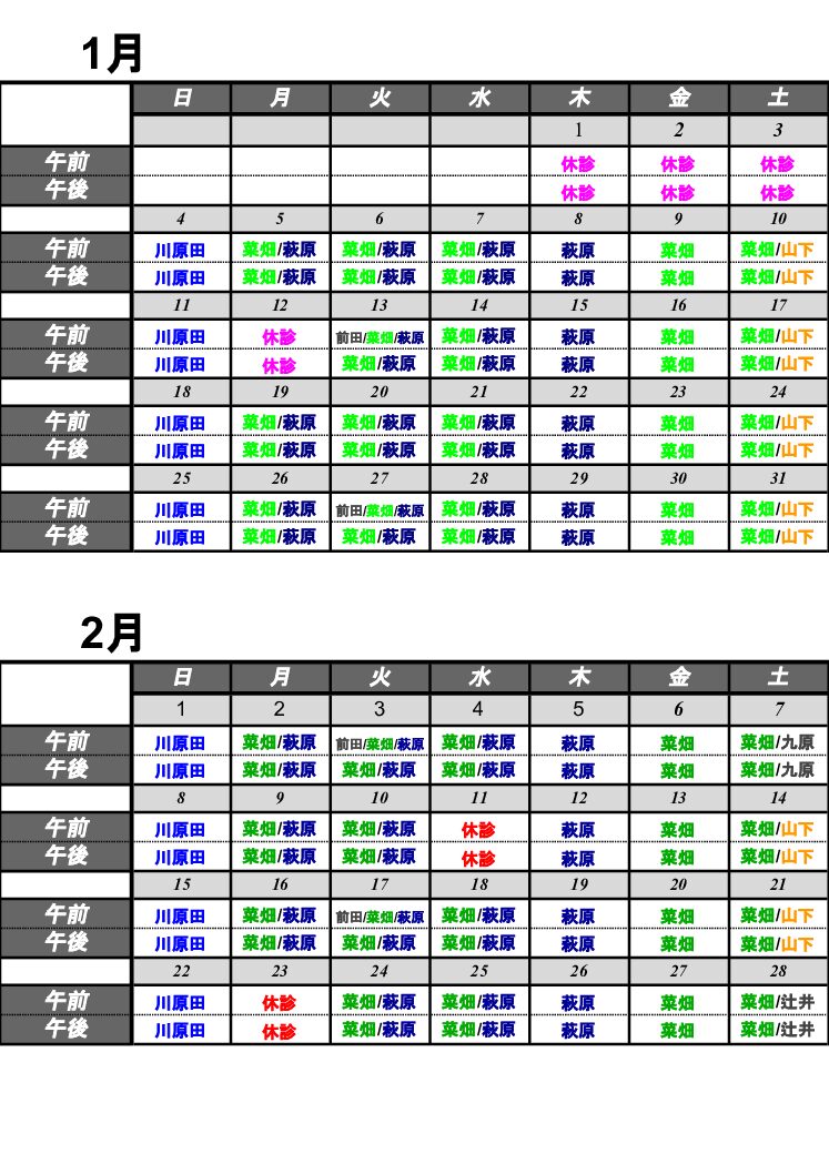 1月・2月の日別診察担当医表の掲載