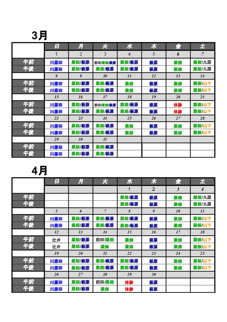 3月・4月の日別診察担当医表の掲載